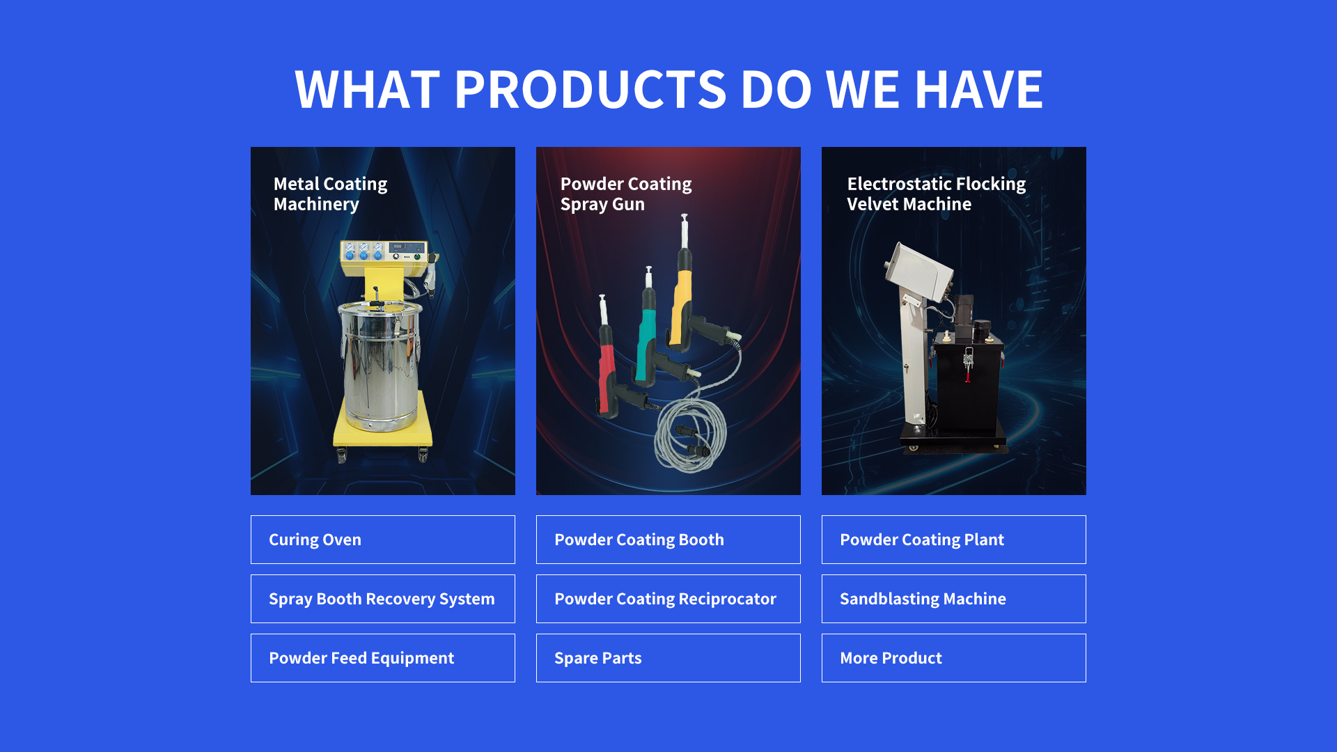 Electrostatic Powder Spraying Gun systems integrate these guns as core application tools. Projects typically combine automated gun movers, powder feed systems, and recovery units to create complete coating solutions.